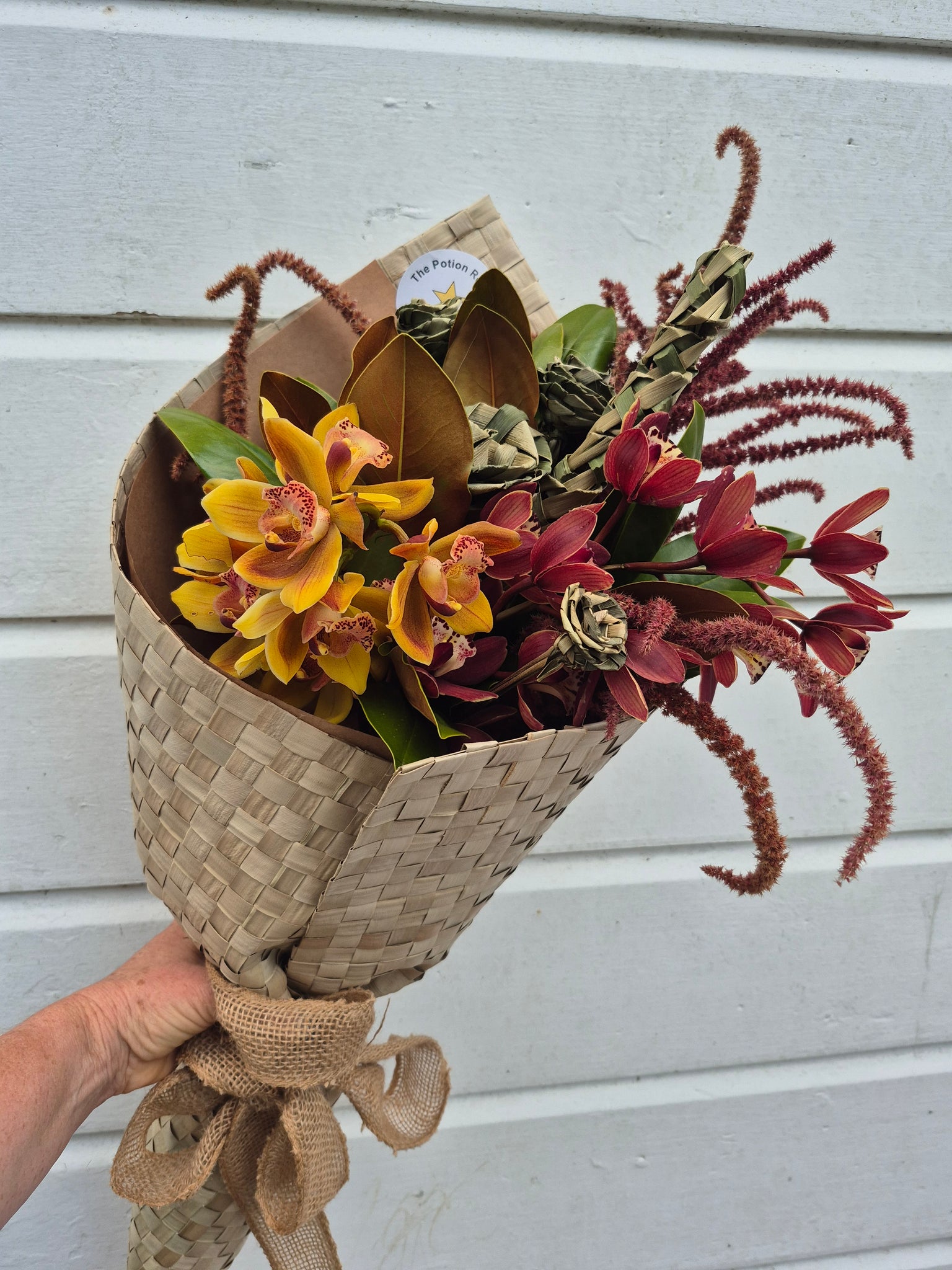 A gorgeous and unique bouquet created with woven on site flax and fresh flowers, along with foliage.
